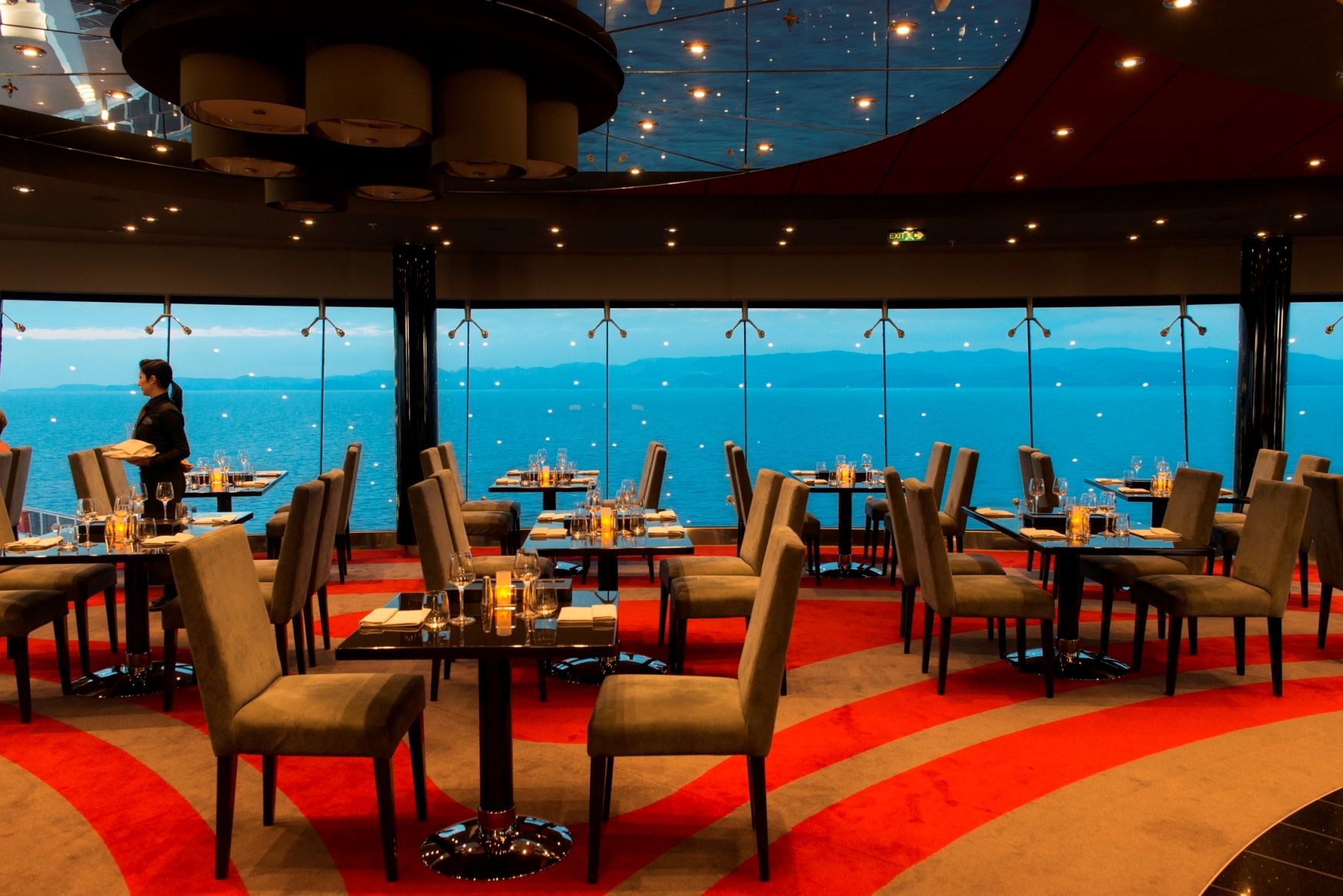 Корабът разполага с няколко заведения за хранене – основен ресторант, разположен на 2 дека, два бюфета на самообслужване, ала карт ресторанти: американски стек хаус Butcher’s Cut, Суши бар, Вила роса – панорамен ресторант.